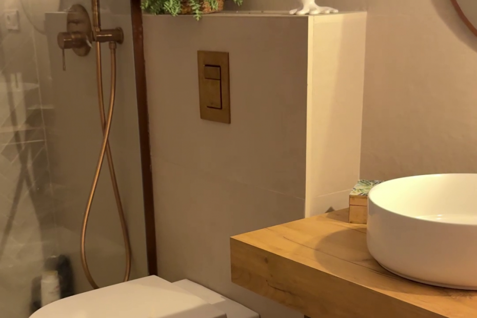 Reforma de baño en Valencia con suelo hidráulico, madera y grifería en cobre