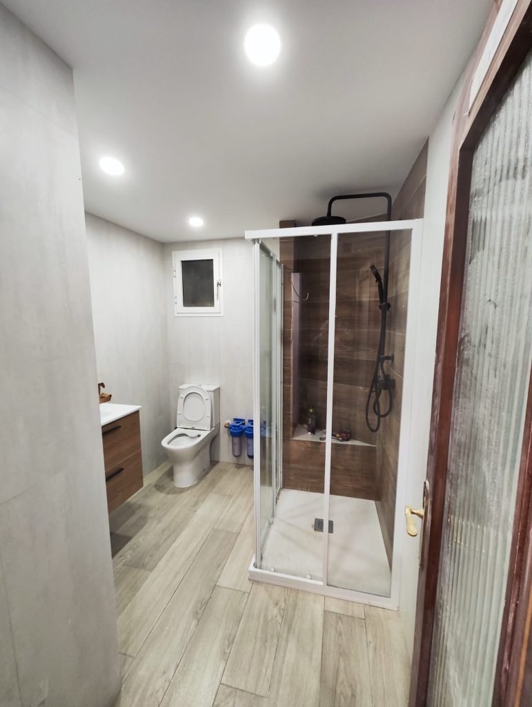 La reforma no solo mejoró la estética del baño, sino que también añadió valor funcional. La sustitución de la bañera por un plato de ducha moderno facilita el uso diario y hace que el baño sea más accesible para todos los miembros de la familia. Además, el diseño con azulejos imitación madera en tonos oscuros y la grifería en negro aportan un estilo contemporáneo y acogedor que transforma el baño en un espacio relajante y atractivo.